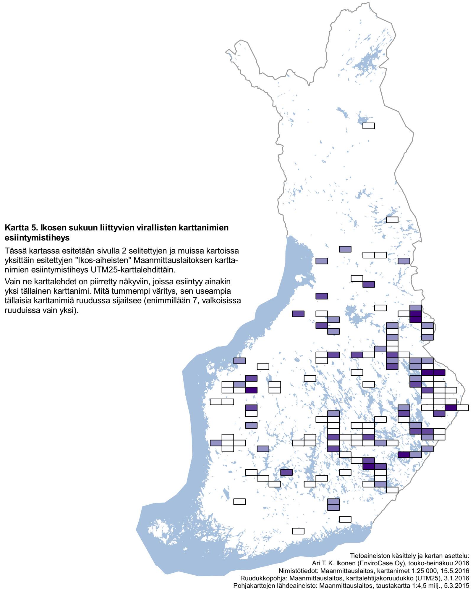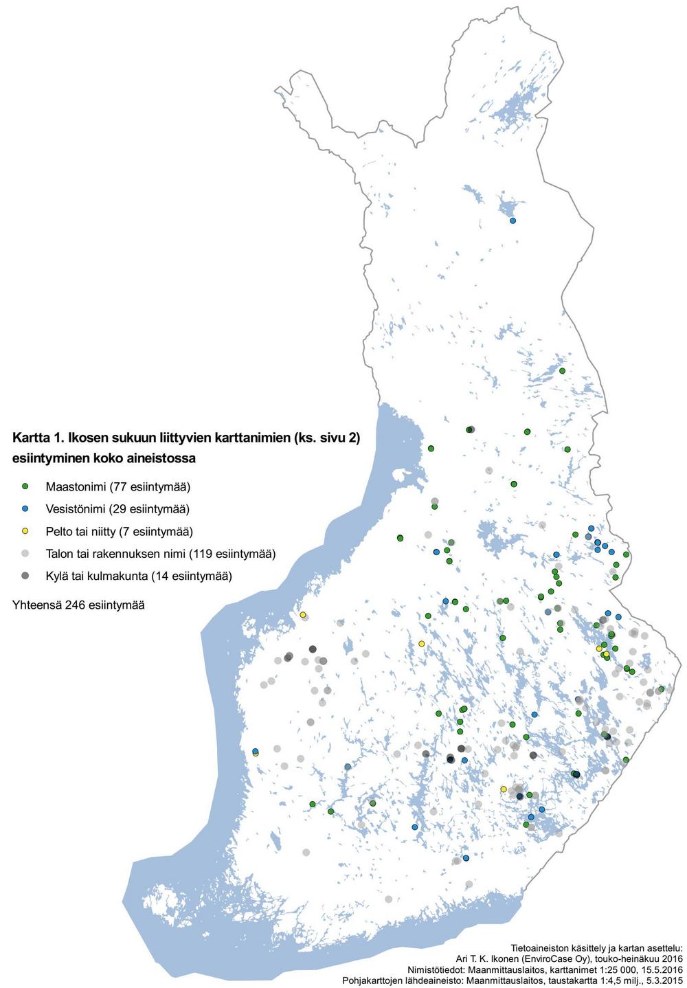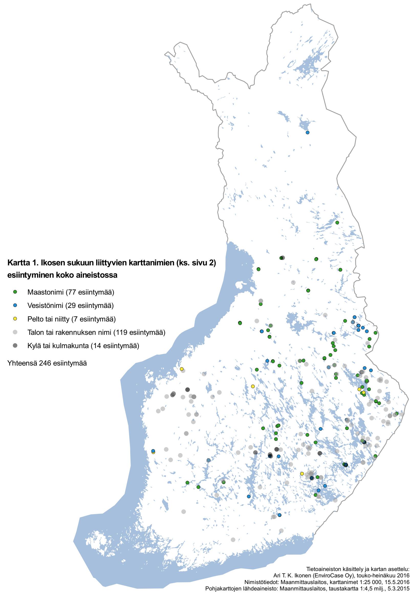 Tästä aineistosta on poimittu Ikosen sukuun liittyvät nimet. Suvun nimi on vaihdellut muodoissa Icoin, Igoin, Iggoin, Iko, Ikoin ja lopulta Ikonen (www.ikosensuku.com, 2.7.2016) useissa kirjoitusasuissa (Piilahti 2002). Asutuspaikan nimenä la-päätteiset nimet ovat olleet yleisiä johdannaisia. Ikosten asuttamia Ikolanimisiä taloja on tiedossa useita (esim. Piilahti 2002). Karttanimiaineistosta on ensin eristetty nimet hauilla *iko*, *ico*, *igo*, *ick* ja *ikå* (ts. nimet joissa kyseinen merkkijono esiintyy jossain kohtaa nimeä), sekä isoin että pienin alkukirjaimin. Tämän jälkeen listaukset on käyty läpi ja tarkoitukseen sopimattomat nimet on karsittu pois. Kuitenkin haku *iko* pienellä alkukirjaimella tuotti niin paljon tässä epäolennaisia esiintymiä, että se jätettiin alustavan tarkastelun perusteella kokonaan käsittelemättä. Lisäksi on huomattava, että esimerkiksi suhteessa Piilahden (2002) luettelemiin kirjoitusasuihin, osa harvinaisemmista muodoista on tässä jäänyt ottamatta huomioon – toisaalta karsittuun listaan ei jäänyt muita kuin haun *Iko* tuloksia.